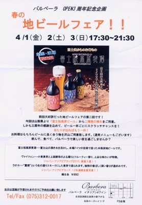 地ビールフェア! 弊店のお薦めレストラン、「バルベーラ」様のオープン3周年記念の春の地ビールフェアのご案内です。4月1日~3日 17:30~21:30 山梨県より「富士櫻高原ビール」から2種類の樽生を!ビール1杯ごとにスクラッチチャンスあり! Barbera イタリアン&ワイン 右京区西院五条西小路下る五条ローズハイツ1階 電話&FAX 075-312-0017 2011年03月18日 9:30
