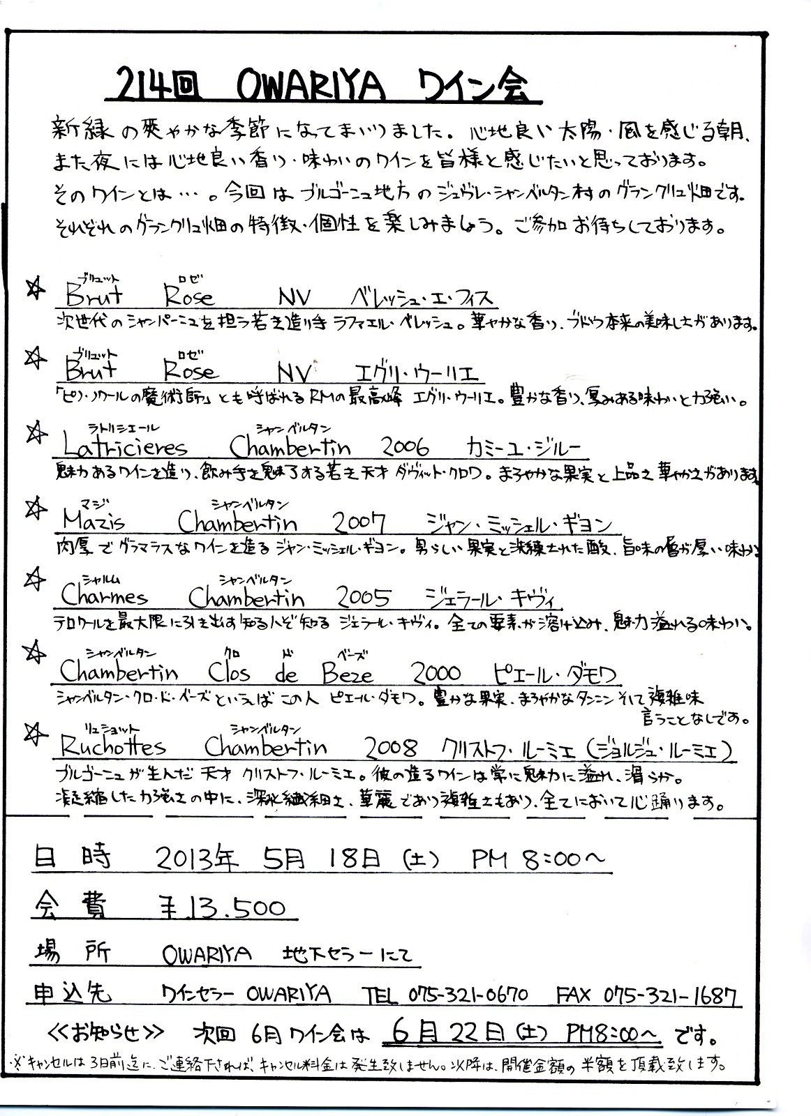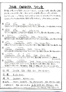 本日はワイン会です 天気予報では 本日は確実に 雨 の、はずでしたが 五月晴れの本日でございます。北海道では今が桜のピークだとか・・・・・・暫く 弊店のワイン会は 雨 の予報の日ばかりだったので 実にすがすがしいです! さて 本日は ジュヴレ・シャンベルタン村の グラン・クリュ畑の飲み比べです。御参加頂ける皆様、ベストの体調でお越し下さい! 2013年05月18日 12:37