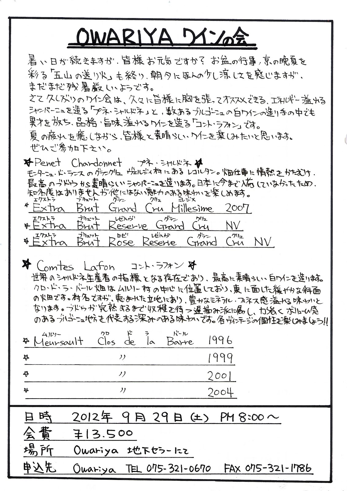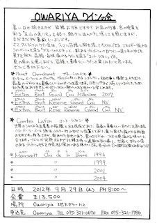 第208回 尾張屋ワイン会のご案内 来月 9月29日(土)20:00pm~ 第208回目の 弊店のワイン会を開催致します。夏の極端に暑い時期と 冬の極端に寒い時期は お休み頂いておりますので 2ヶ月ぶりとなります。今回は、『プネ・シャルドネ』と、『コント・ラフォン』特集です。 ご参加お待ちしております! 2012年08月25日 14:03