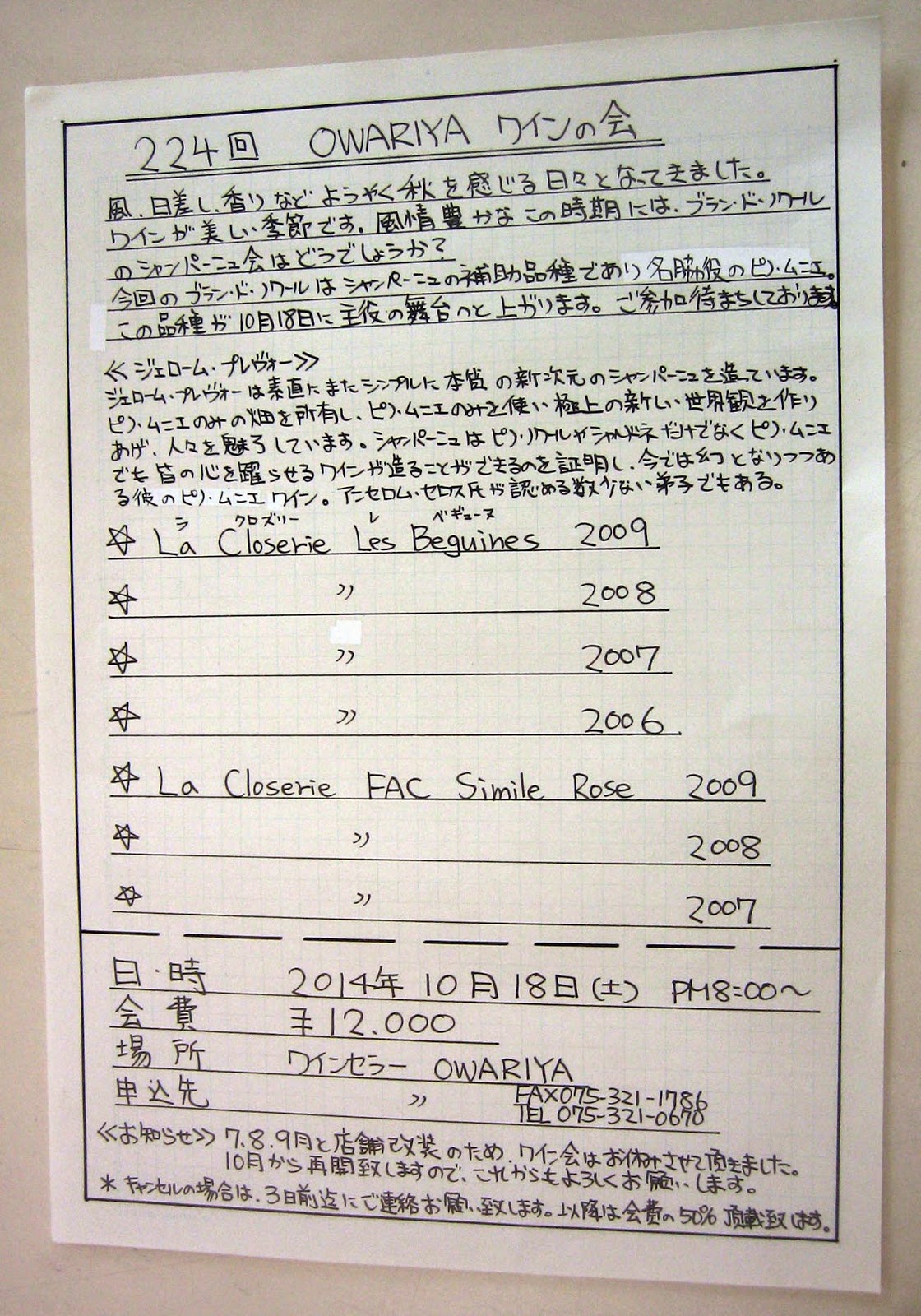 第224回 OWARIYAワイン会のご案内 お待たせ致しました。OWARIYAワン会 再開致します。10月18日(土) 20:00pmから 弊店地下セラーにて。 テーマは「ジェローム・プレヴォーのピノ・ムニエ」です。 会費 12000円(税込)お席に限りがございます。お申し込みはお早めに! 2014年09月20日 15:05