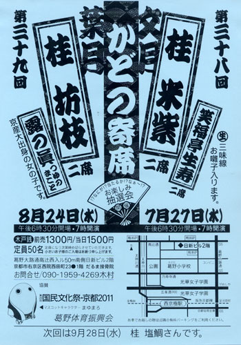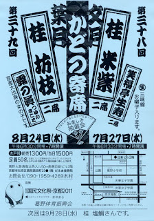 第38回&39回 かどの寄席 次回のかどの寄席は 7月27日(水) 18:30pm~ 桂 米紫&笑福亭生寿さんの 2席。 葉月のかどの寄席は 8月24日(水) 18:30pm~ 桂 坊枝&露の眞さんの 2席。 葉月の日は 地蔵盆なんかもやってる頃ですね・・・・ 梅雨も明けたし 一気に夏が来て 一気に終わってしまいそうです・・・・・・ 2011年07月09日 13:51