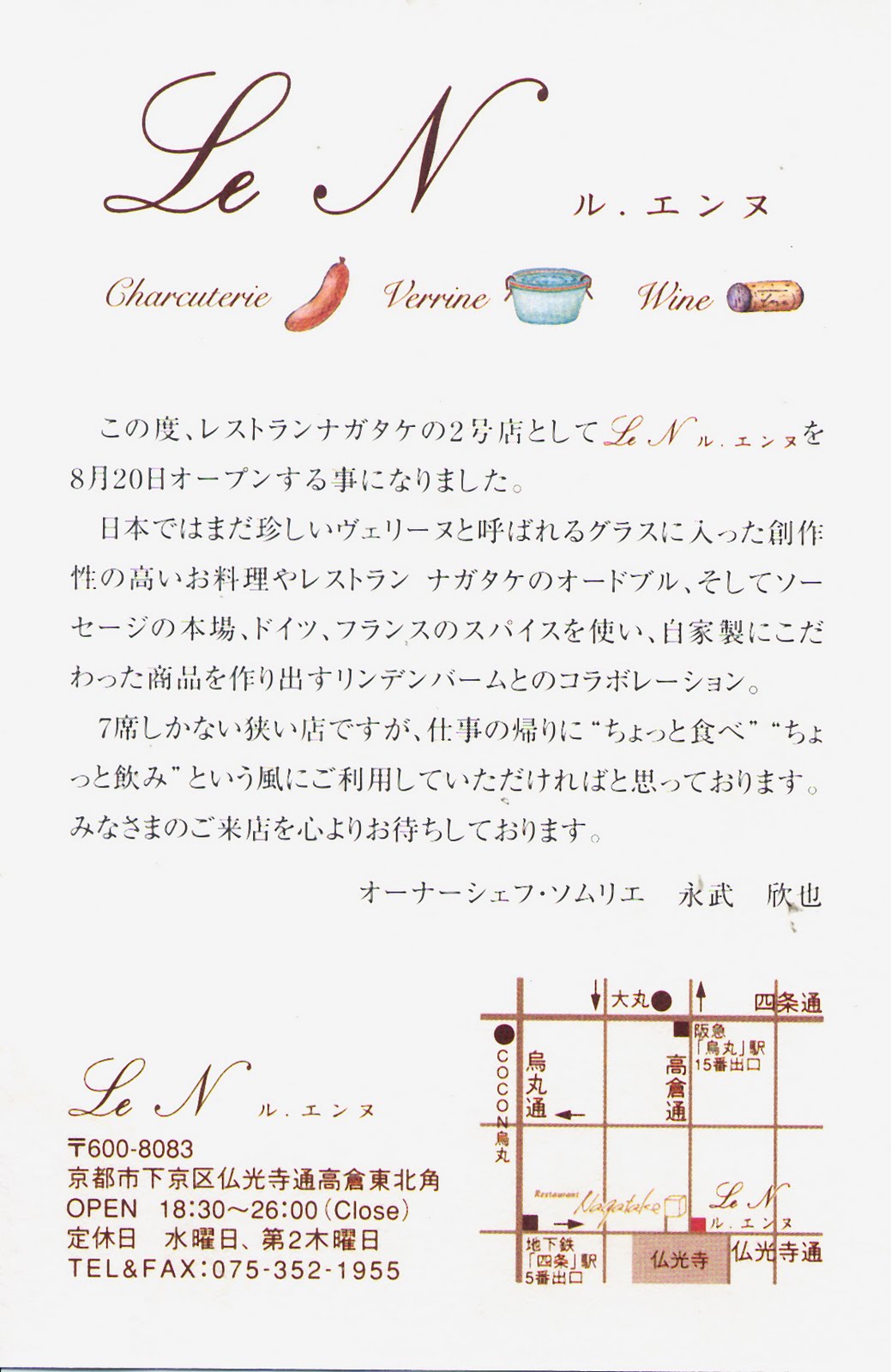名前は LE N(ル・エンヌ)。ソーセージの本場 ドイツ、フランスのスパイスを使い また NAGATAKEのオードブルなど をリーズナブルな料金で召し上がって頂けるレストランです。